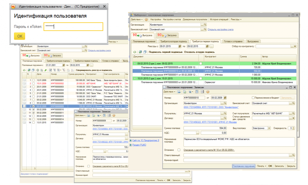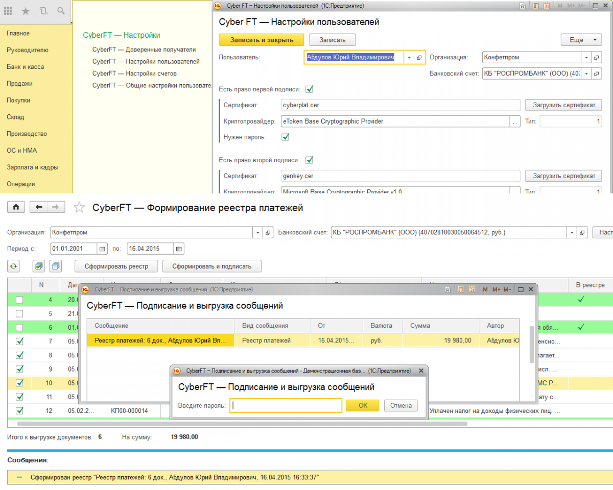 Платежный модуль CyberFT 1С, разработанный Компанией «КиберПлат», позволяет клиентам из интерфейса системы 1С создавать, подписывать и отправлять в банк различные платежные документы, включая рублевые и валютные переводы, заявки на покупку и продажу валюты, документы валютного контроля и др., а также принимать из банка выписки, сообщения и информацию по статусам отправленных документов.