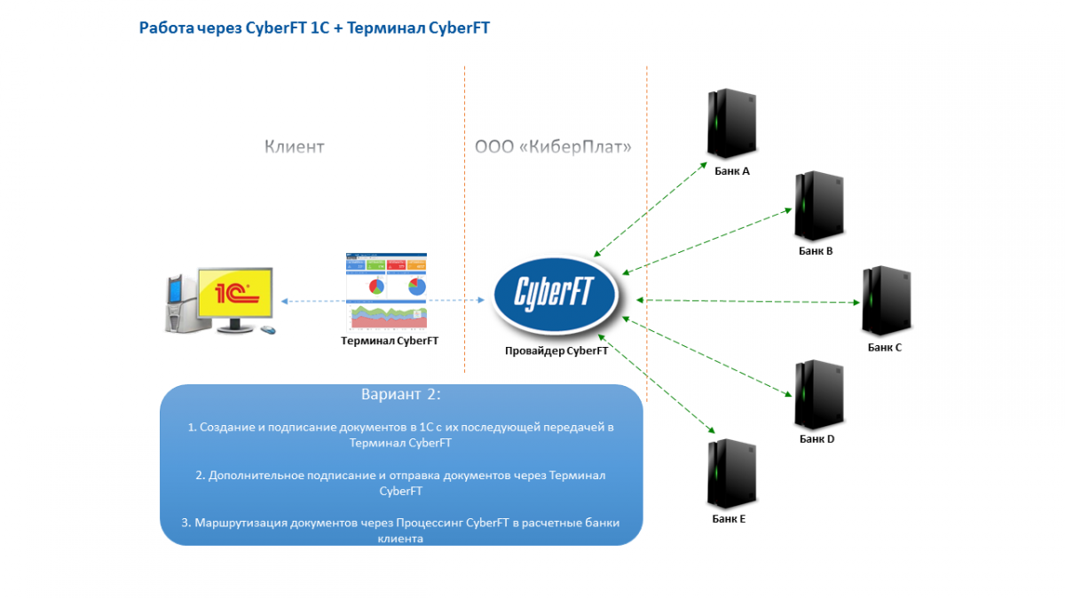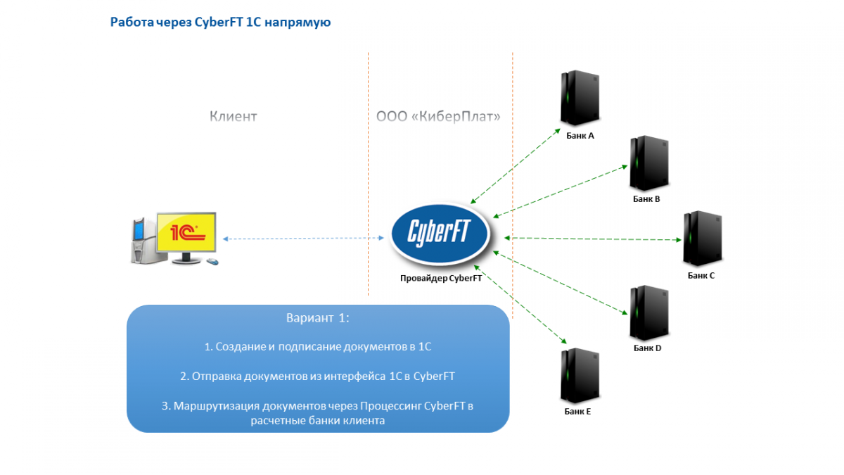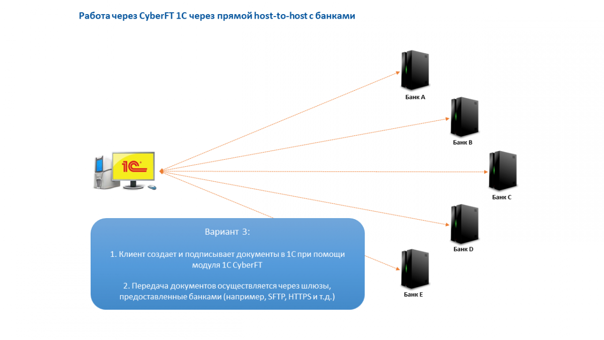Взаимодействие клиента через модуль CyberFT 1C с банками может быть организовано различными способами: